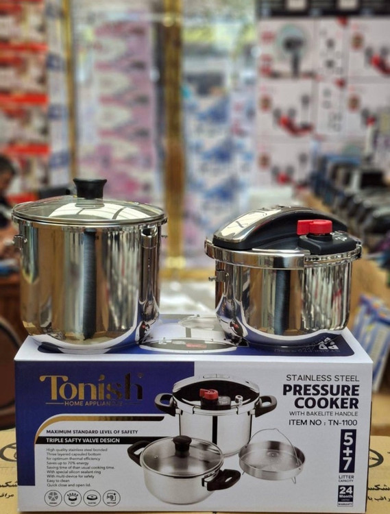 بدنه استیل ضد زنگ _ کف چدن _دسته ها باکالیت نسوز _ دارای سه سوپاپ اطمینان